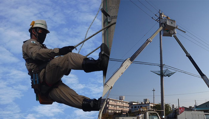 電気を沖縄県の方々にお届けするために配電線設備工事を行なっています。これらの建設や保守・点検も重要な仕事です。また、自然災害、事故災害時などには、総力を挙げて復旧作業を行ない、電気をご利⽤いただいている地域のみなさまから高い評価をいただいております。